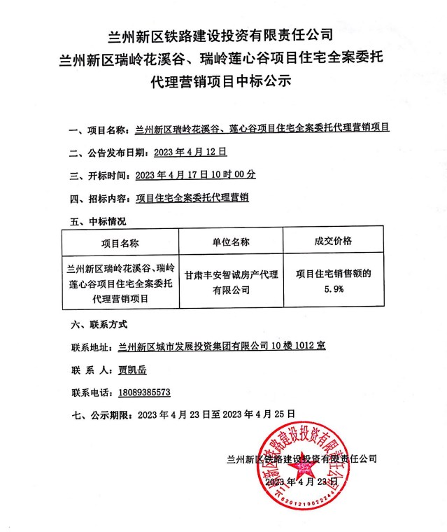 兰州新区铁路建设投资有限责任公司兰州新区瑞岭花溪谷、瑞岭莲心谷项目住宅全案委托署理营销中标公示