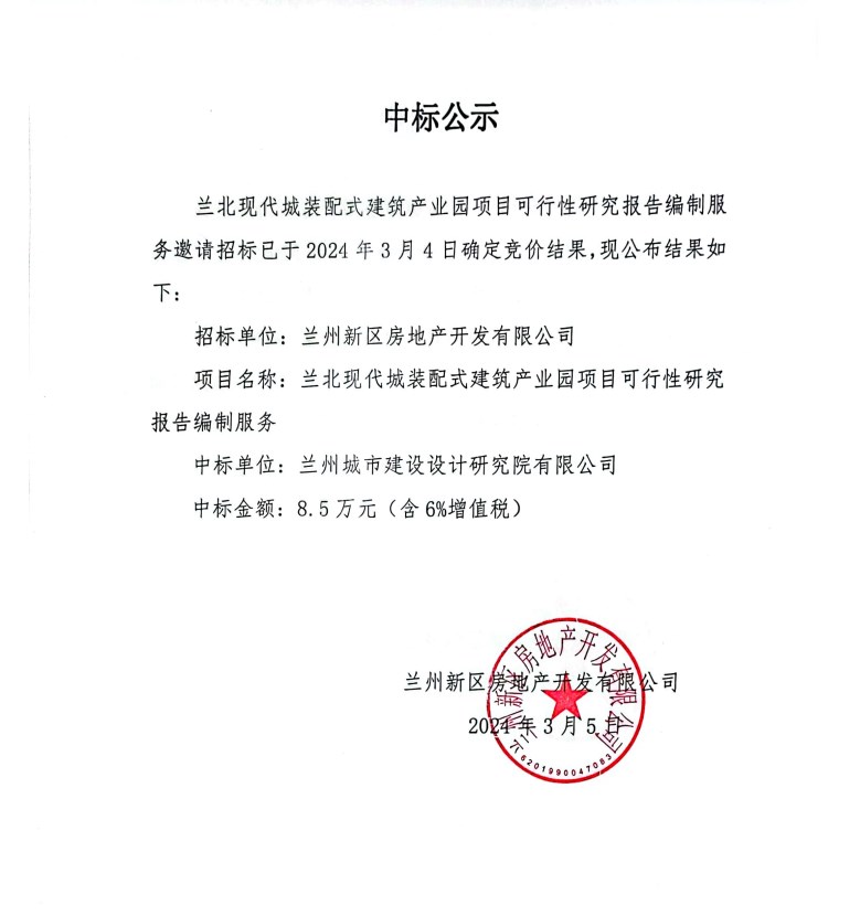 兰北现代城装配式修建工业园项目可行性研究报告体例服务中标公示