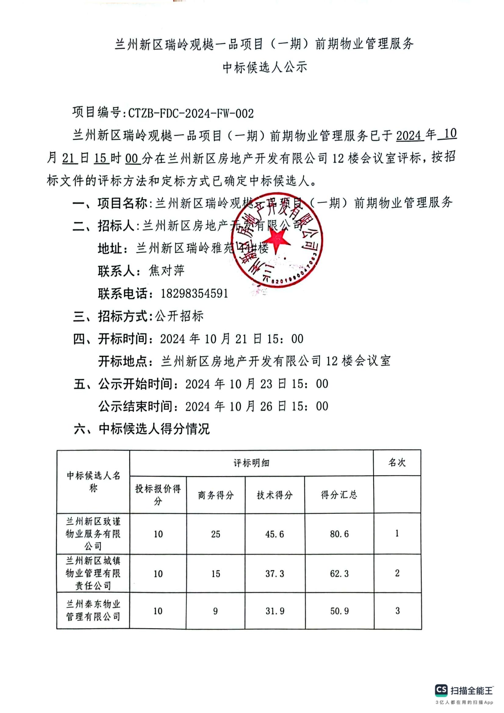 兰州新区瑞岭观樾一品项目(一期)前期物业治理服务中标候选人公示