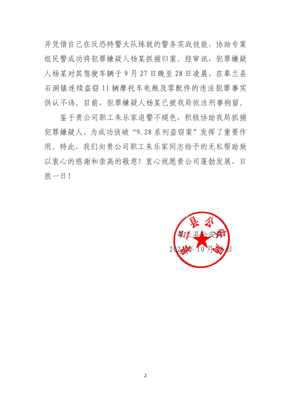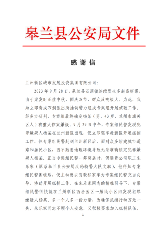 克日,新区3044am永利集团集团收到一封来自皋兰县公安局的谢谢信,信中对瑞岭咨询监理公司监理员朱乐家退警不褪色,协助抓获“9.28系列偷窃案”逃犯杨某的行为体现衷心谢谢。